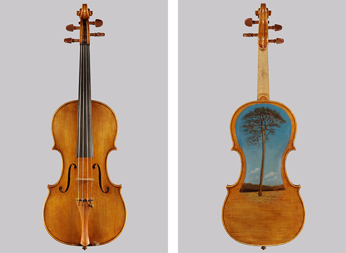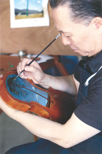 ヴァイオリンの裏板には、中澤氏の古くからの友人である二胡の演奏家・画家である武楽群氏が、被災地の復興を願い“奇跡の一本松”をモチーフとした絵を描きました。演奏で絵が薄れるとその度に描き直し、楽器のシンボルとなっています。現在、ヴァイオリン4挺、ヴィオラ2挺、チェロ2挺、分数ヴァイオリン1挺が出来上がっています。